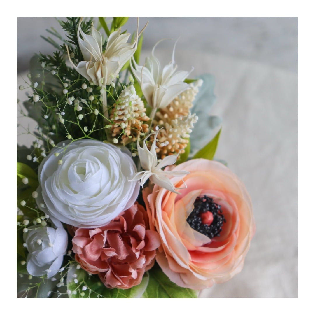 ふんわりと優しいホワイトとコーラルピンクのラナンキュラスをメインに、