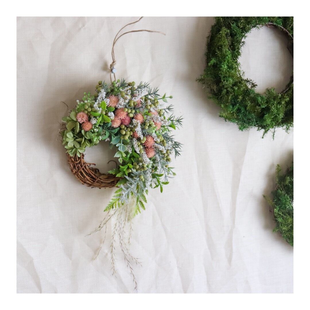 柔らかい色合いの千日紅、ドライの花たちをちりばめて。
