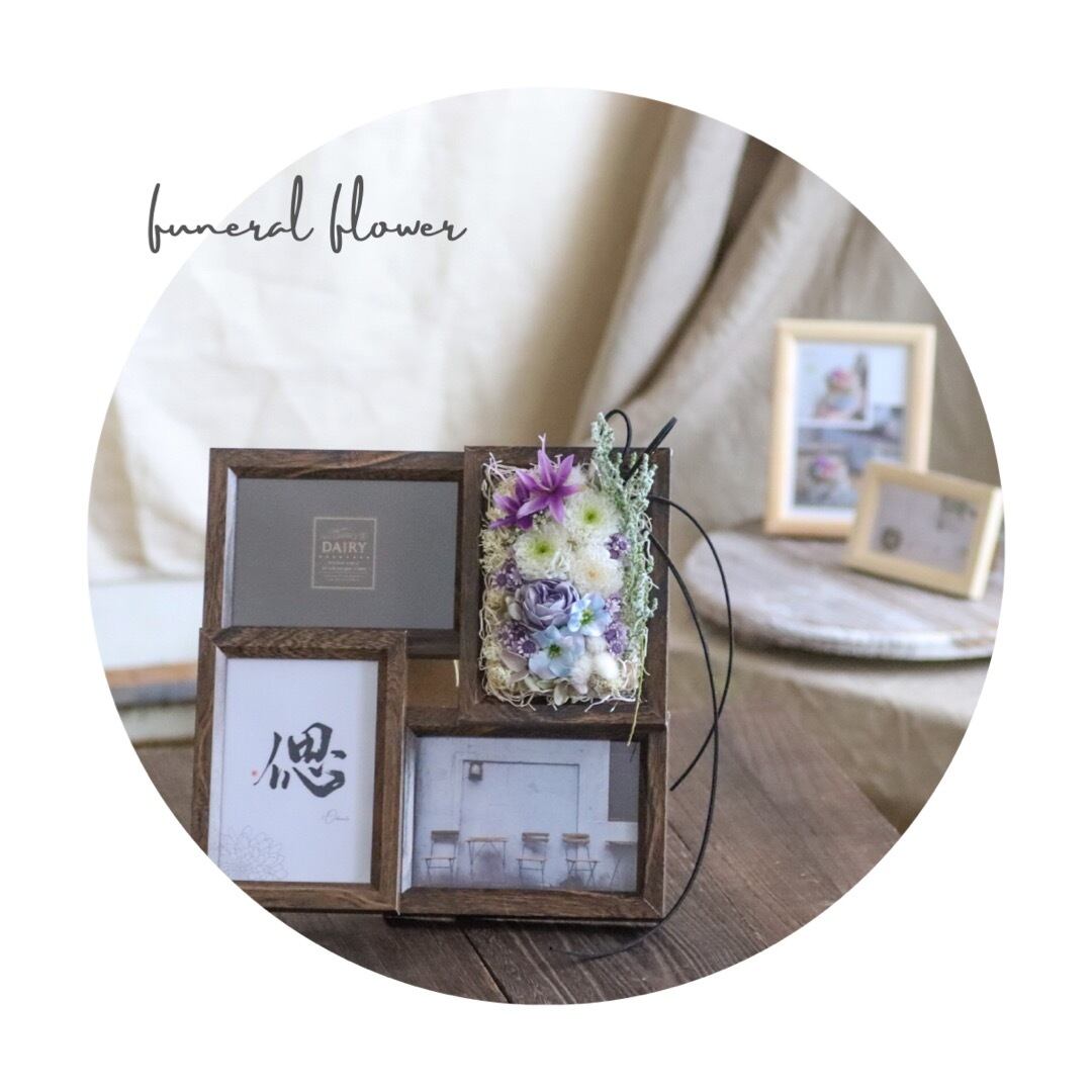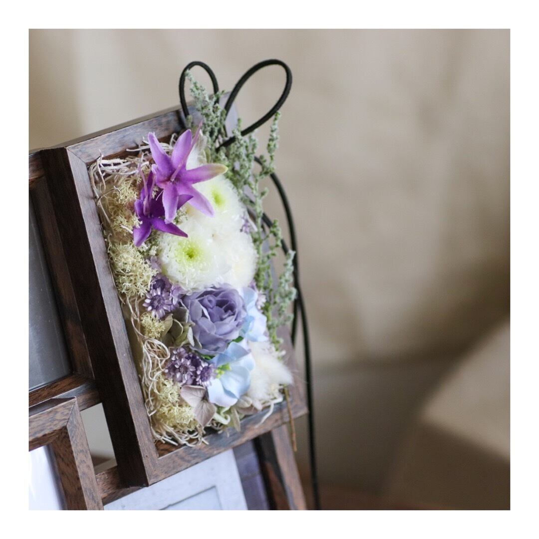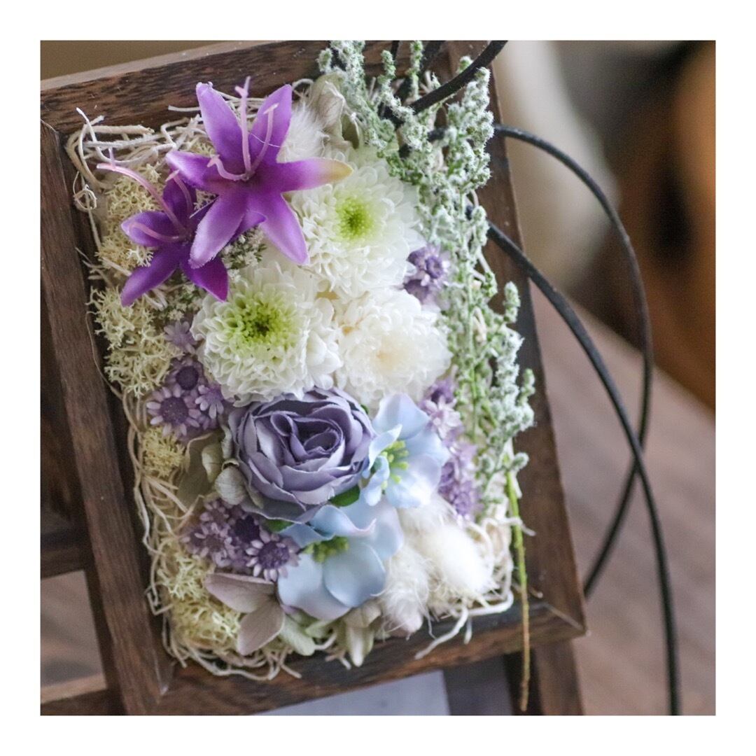 ホワイト&ブルー、パープル系の花材で仕上げました。