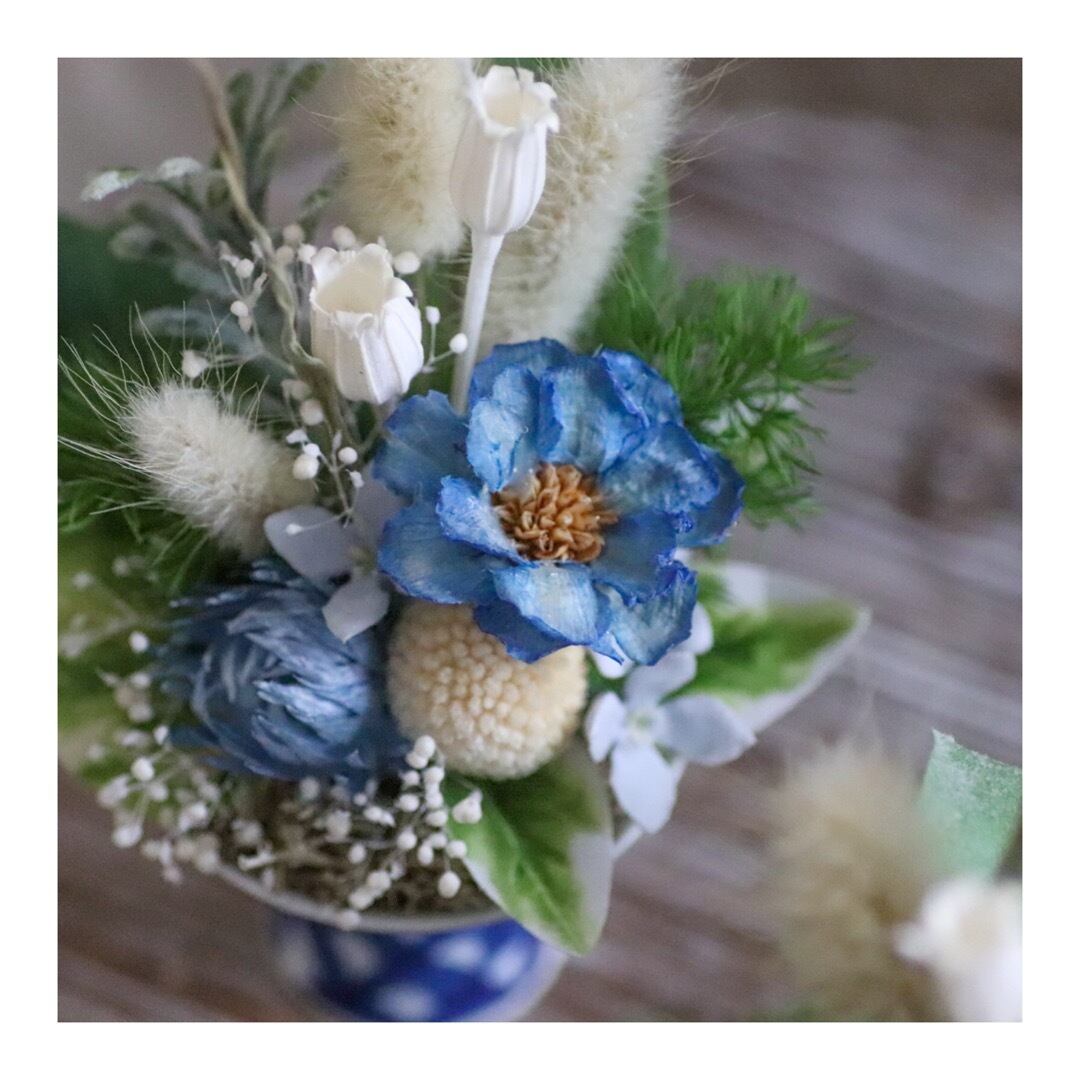 ブルーの花材が多いアレンジメントは、
